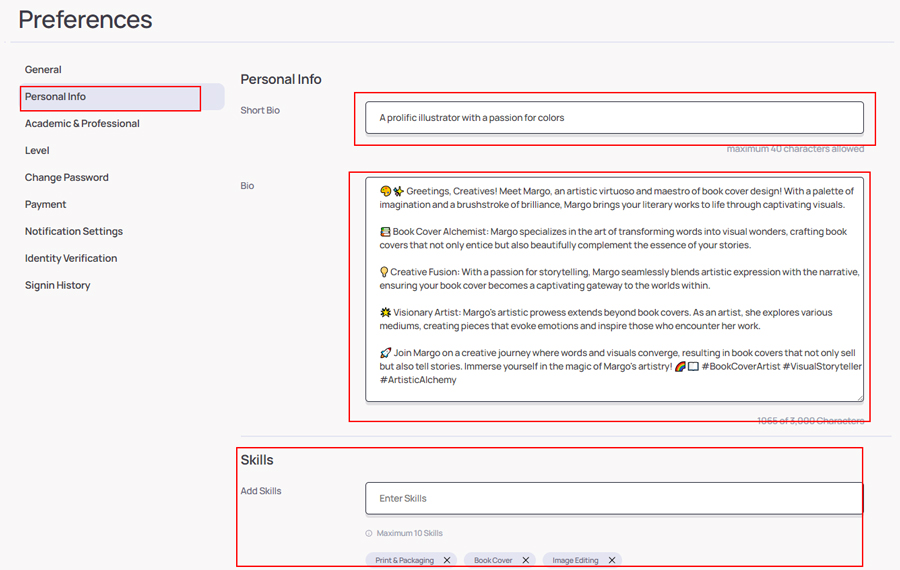 - Filling out your bio and skills in preferences.