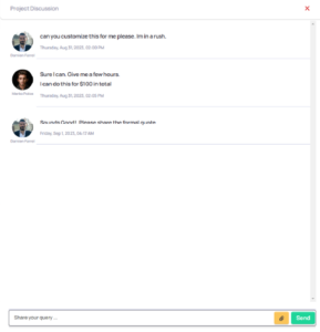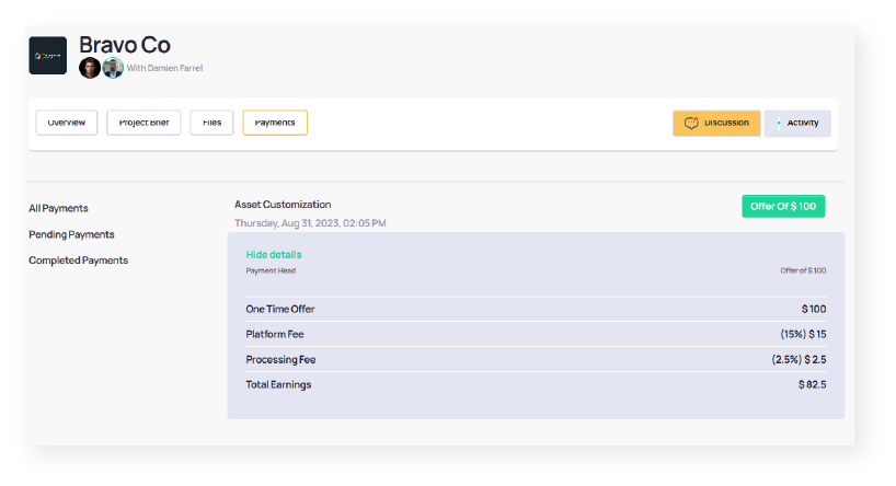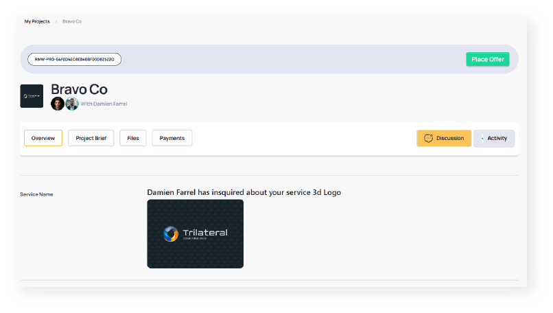 On the right, you’ll find a “Discussion” button to communicate with the client and upload files. The “Activity” view shows a general flow of your project.