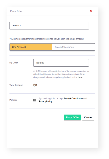 Once you discuss the project details with the client and agree to work, simply press the “Place Offer” button to create an offer invoice. You can create your offer as a single invoice or milestone-based offer.